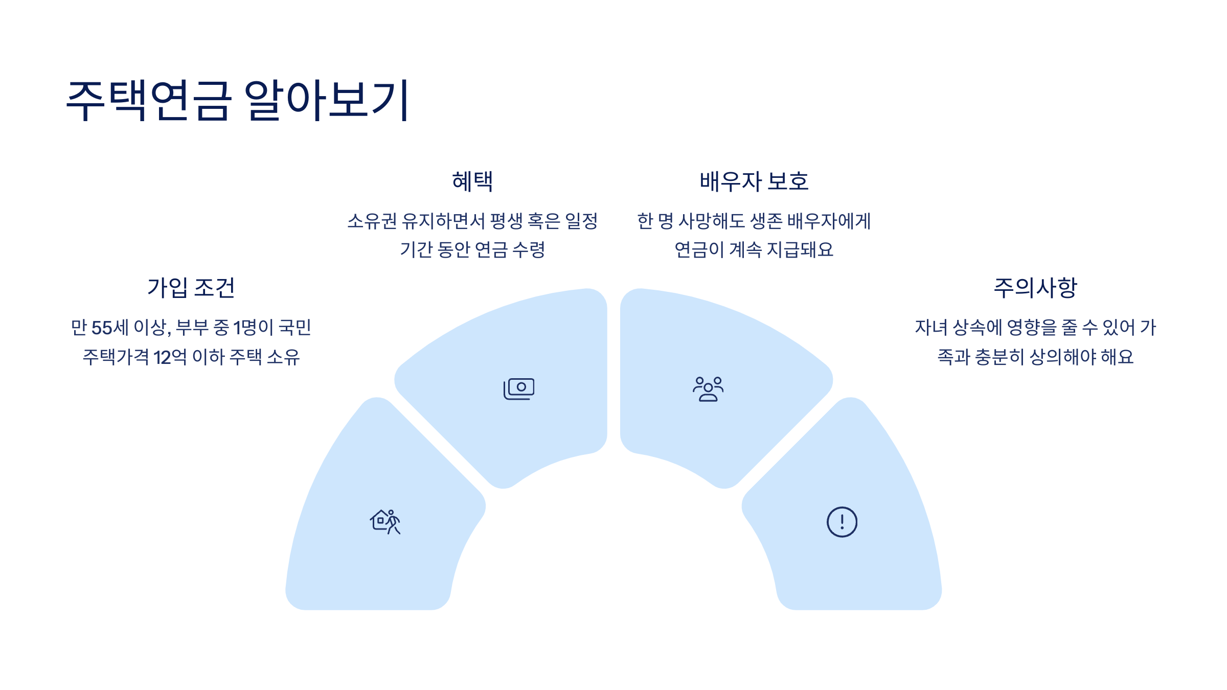 주택연금은 말 그대로 ‘내 집을 담보로 연금을 받는 제도’예요. 만 55세 이상이며, 부부 중 1명이 국민주택가격 12억 이하 주택을 소유하고 있다면 신청할 수 있어요.