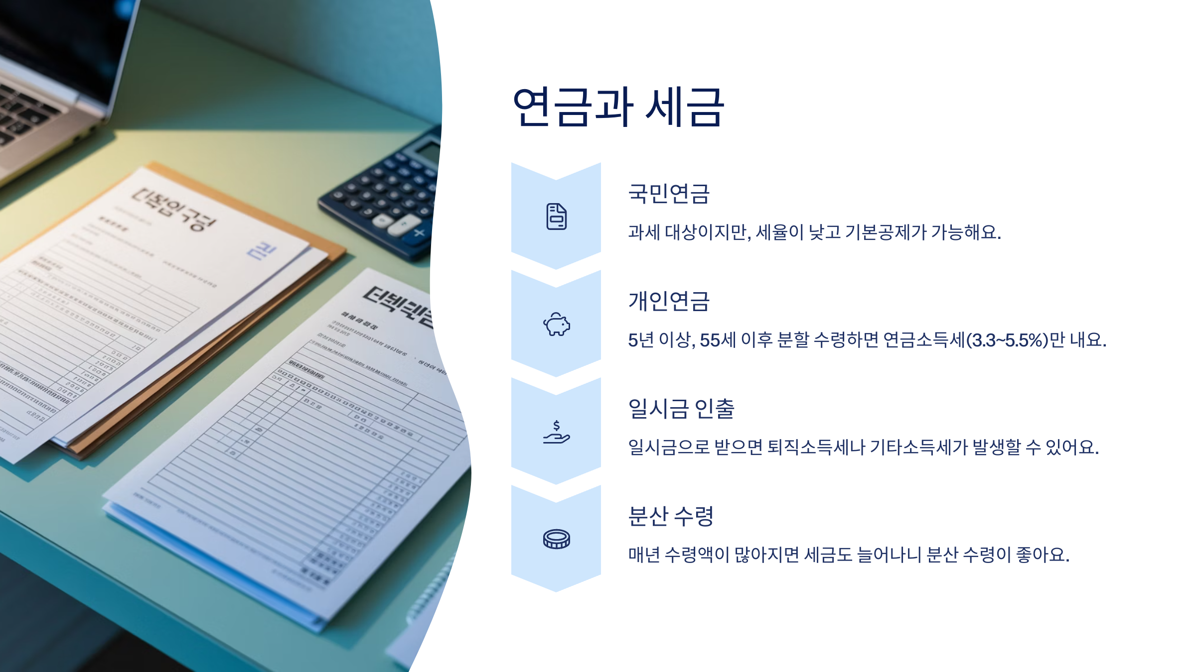 국민연금은 과세 대상이지만, 세율이 낮고 기본공제가 가능해요. 반면 개인연금(연금저축, IRP 등)은 5년 이상, 55세 이후 분할 수령하면 연금소득세(3.3~5.5%)만 부담하면 돼요.