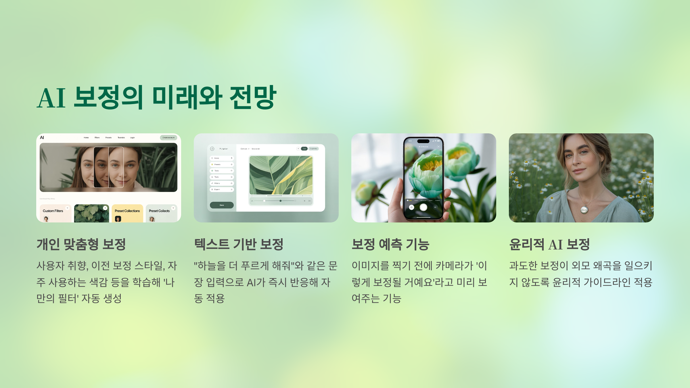 이제 마지막으로 🌟 AI 사진 보정의 미래와 전망에 대해 정리해볼게요! 과연 앞으로는 어떤 기능까지 가능해질까요? 기대되시죠? 🤖