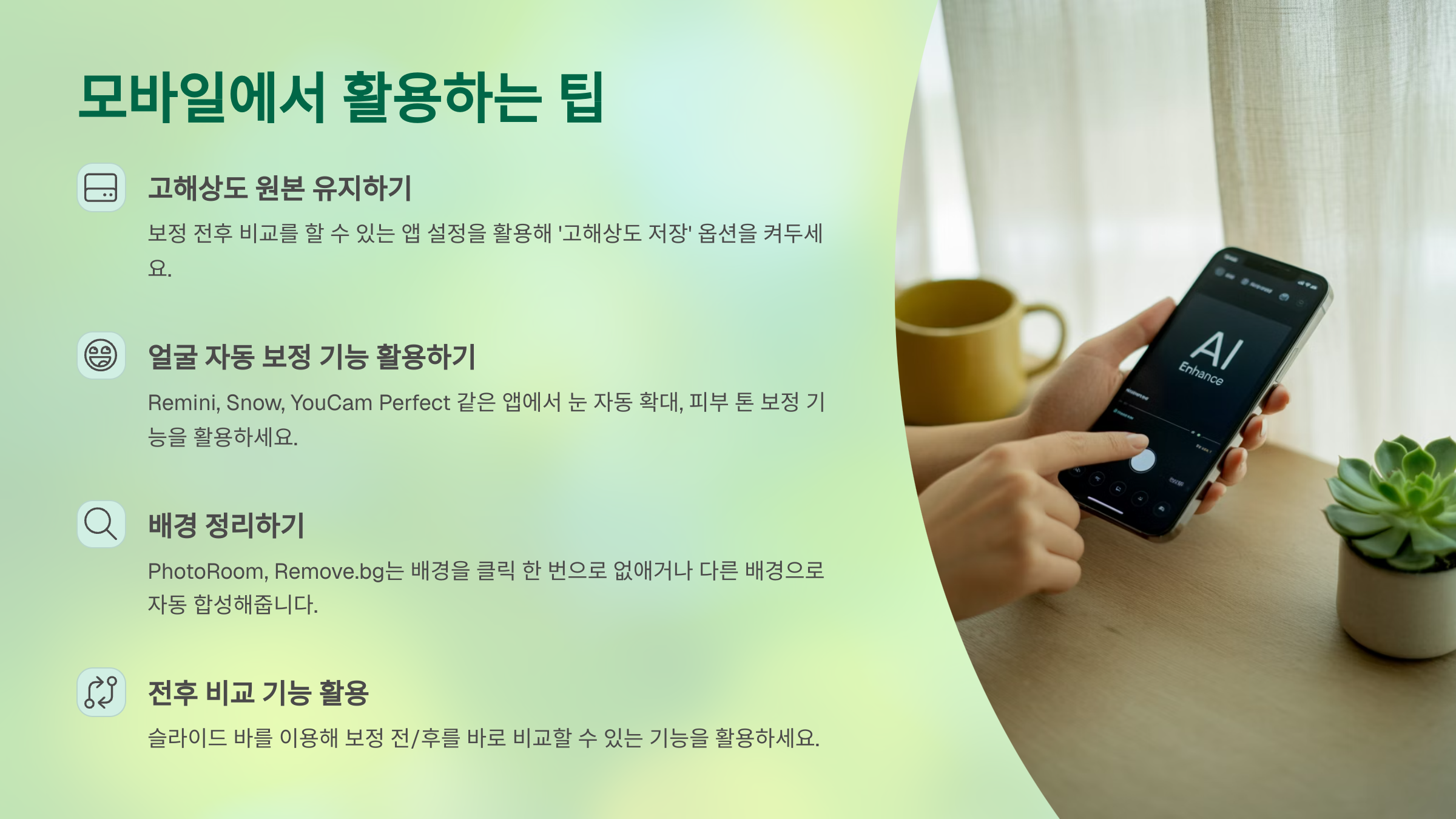 이제 다음은 📱 모바일에서 AI 보정 활용 팁을 알아볼 차례예요! 스마트폰 하나면 충분한 시대, 실전 팁 함께 알아봐요! 😊