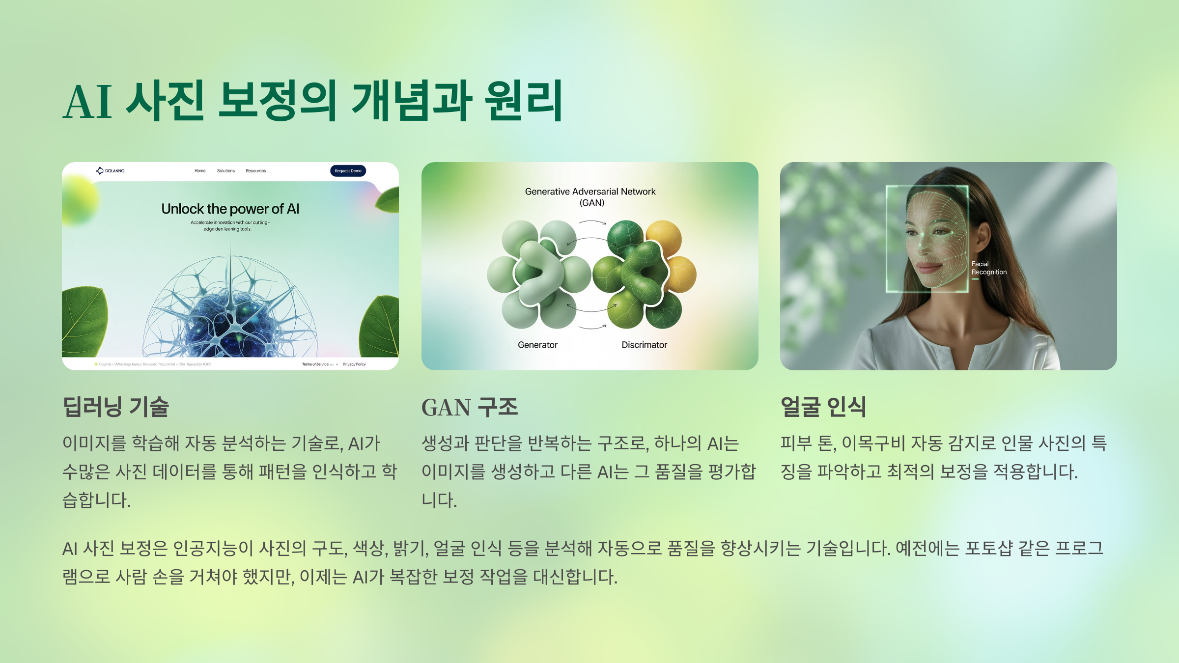 AI 사진 보정이란 인공지능이 사진의 구도, 색상, 밝기, 얼굴 인식 등을 분석해서 자동으로 품질을 향상시키는 기술이에요. 예전에는 포토샵 같은 프로그램으로 사람 손을 거쳐야 했지만, 이제는 AI가 그 복잡한 보정 작업을 대신해주는 시대가 된 거죠. 🧠