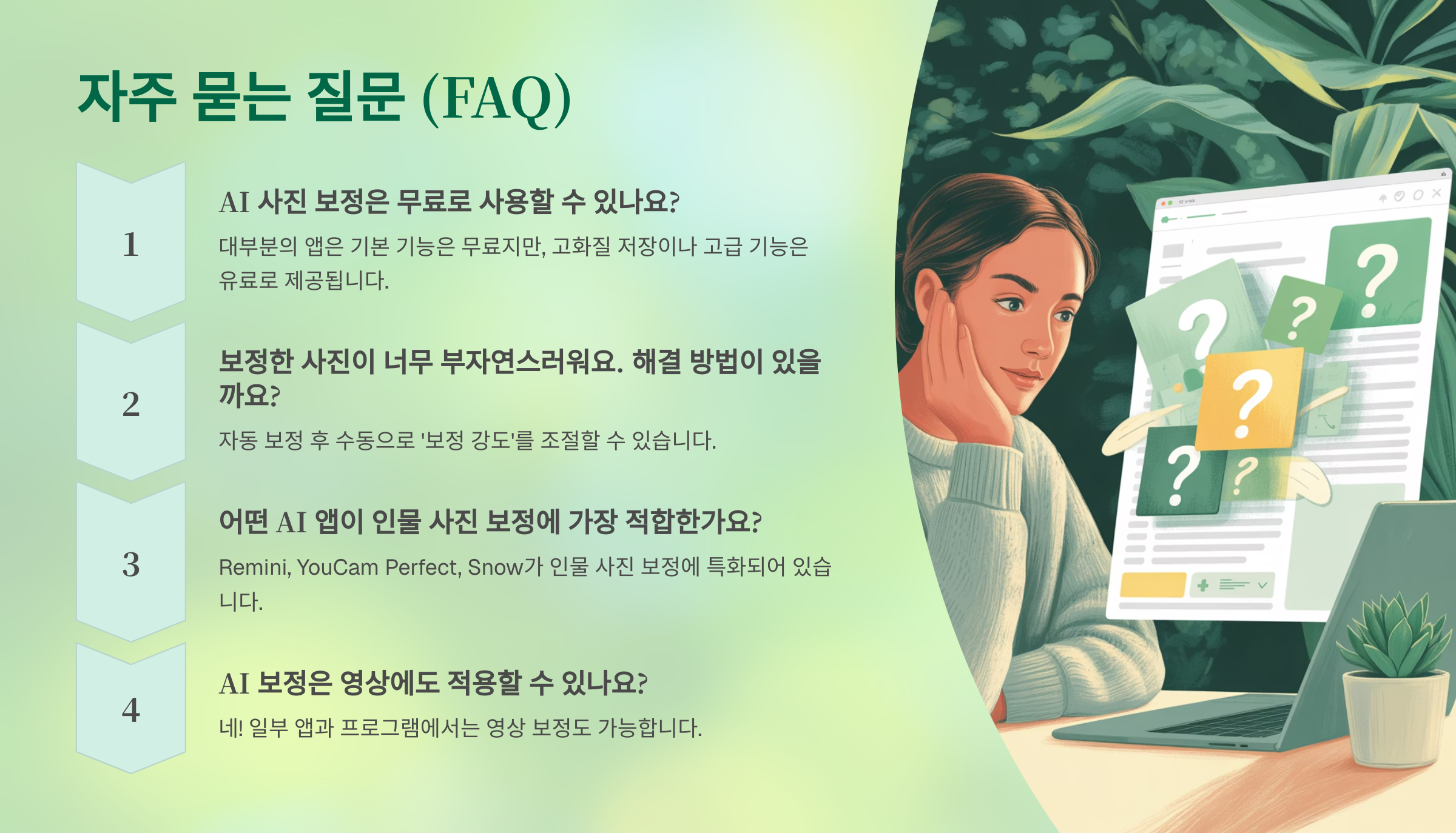 이제 마지막으로 ❓ AI 사진 보정 FAQ 정리할게요! 지금 당장 궁금했던 질문들, 시원하게 풀어드릴게요! 🧠