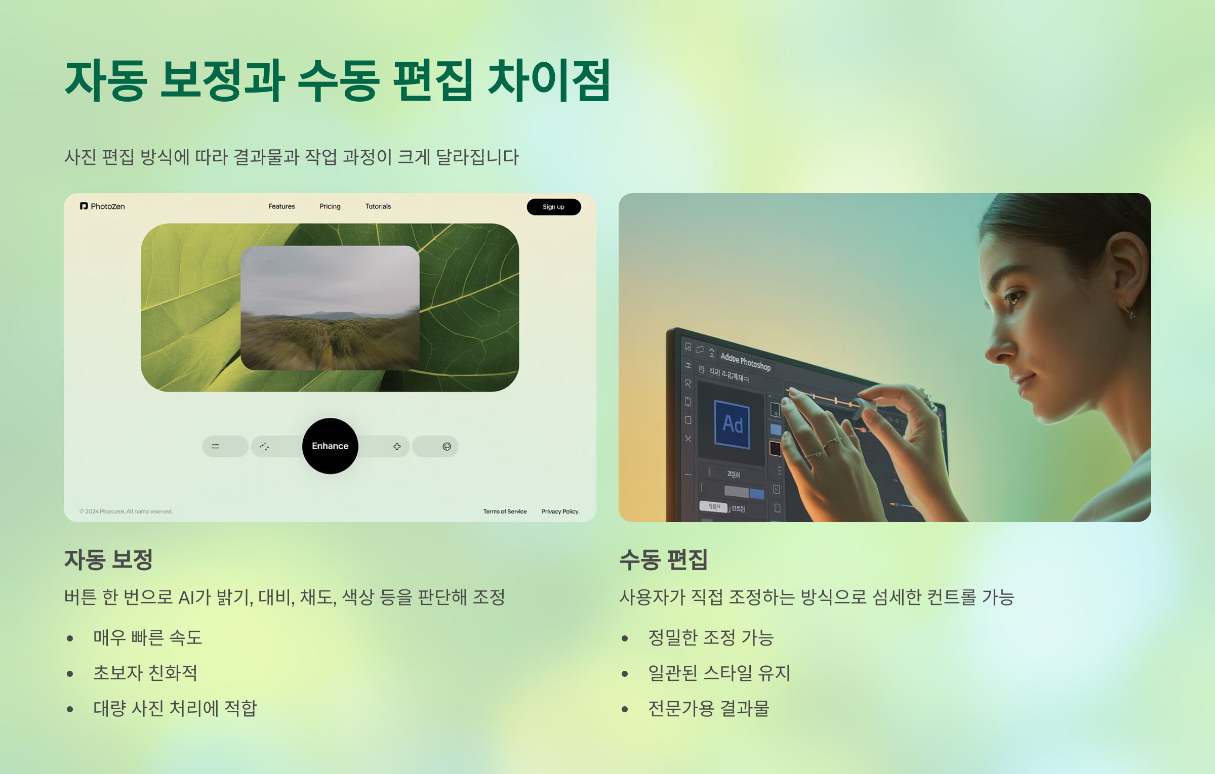 사진 편집에는 크게 두 가지 방식이 있어요. 하나는 AI가 알아서 처리해주는 ‘자동 보정’, 다른 하나는 사용자가 직접 조정하는 ‘수동 편집’이에요. 두 방식 모두 장단점이 분명해서, 상황과 목적에 따라 잘 선택하는 게 중요해요. 😎