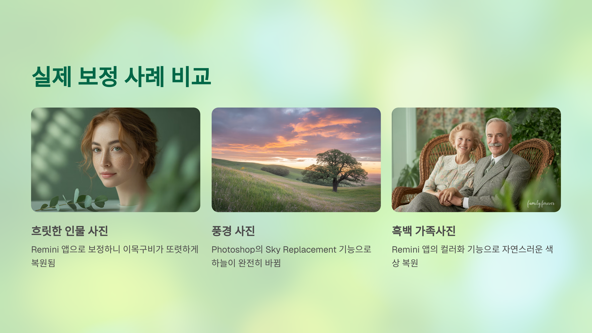 이러한 사례들은 단순히 이미지 품질 향상뿐 아니라, 감정과 추억까지 되살려주는 보정의 힘을 보여줘요. 특히 AI 보정은 사람이 놓칠 수 있는 세세한 부분까지 반영되기 때문에, 결과물이 훨씬 자연스럽고 생생해져요.